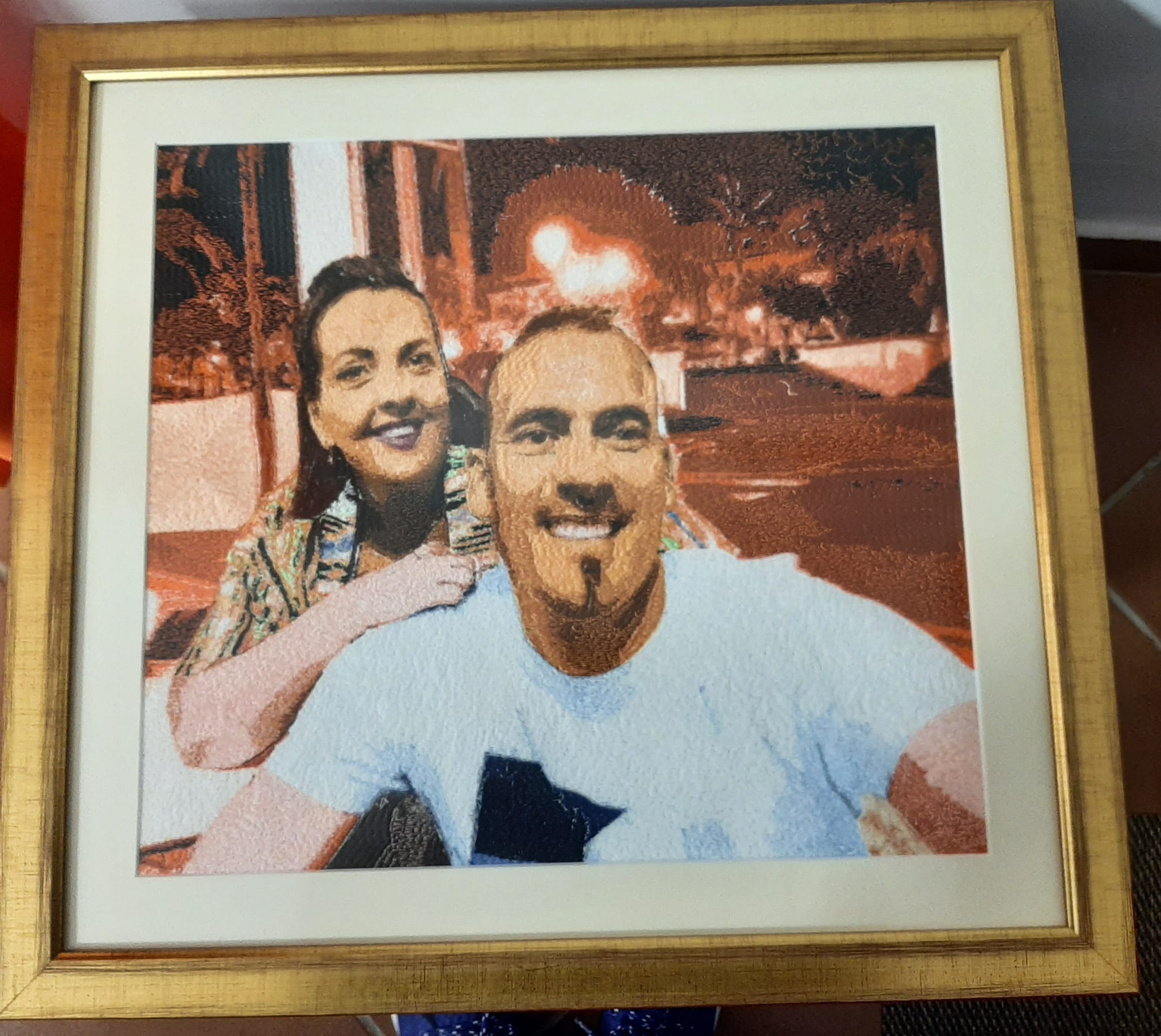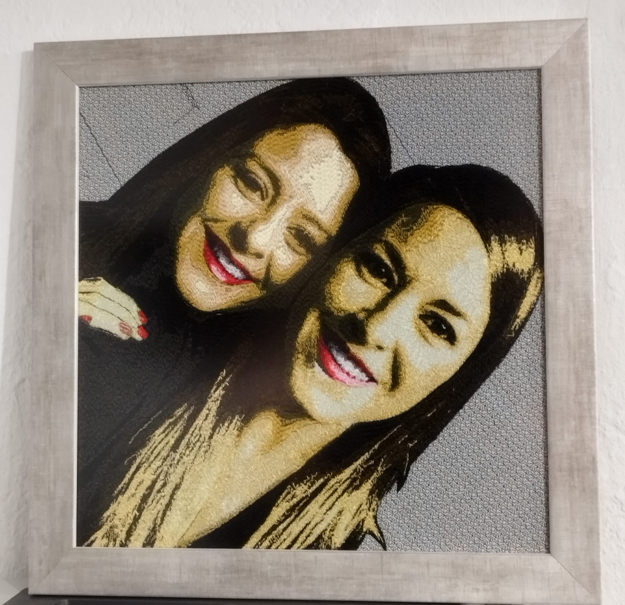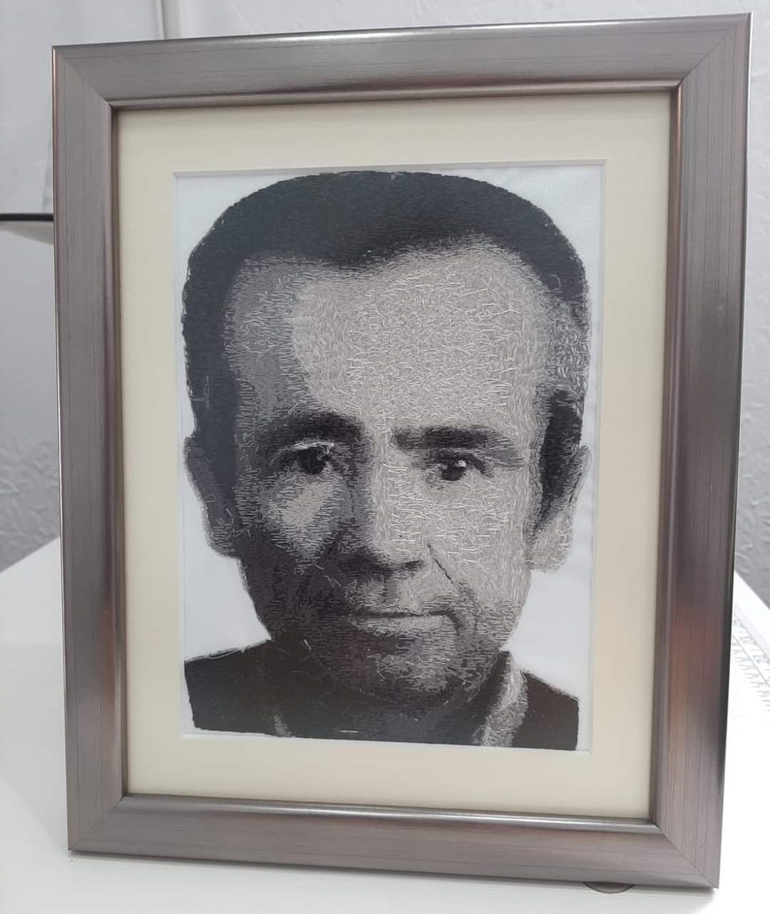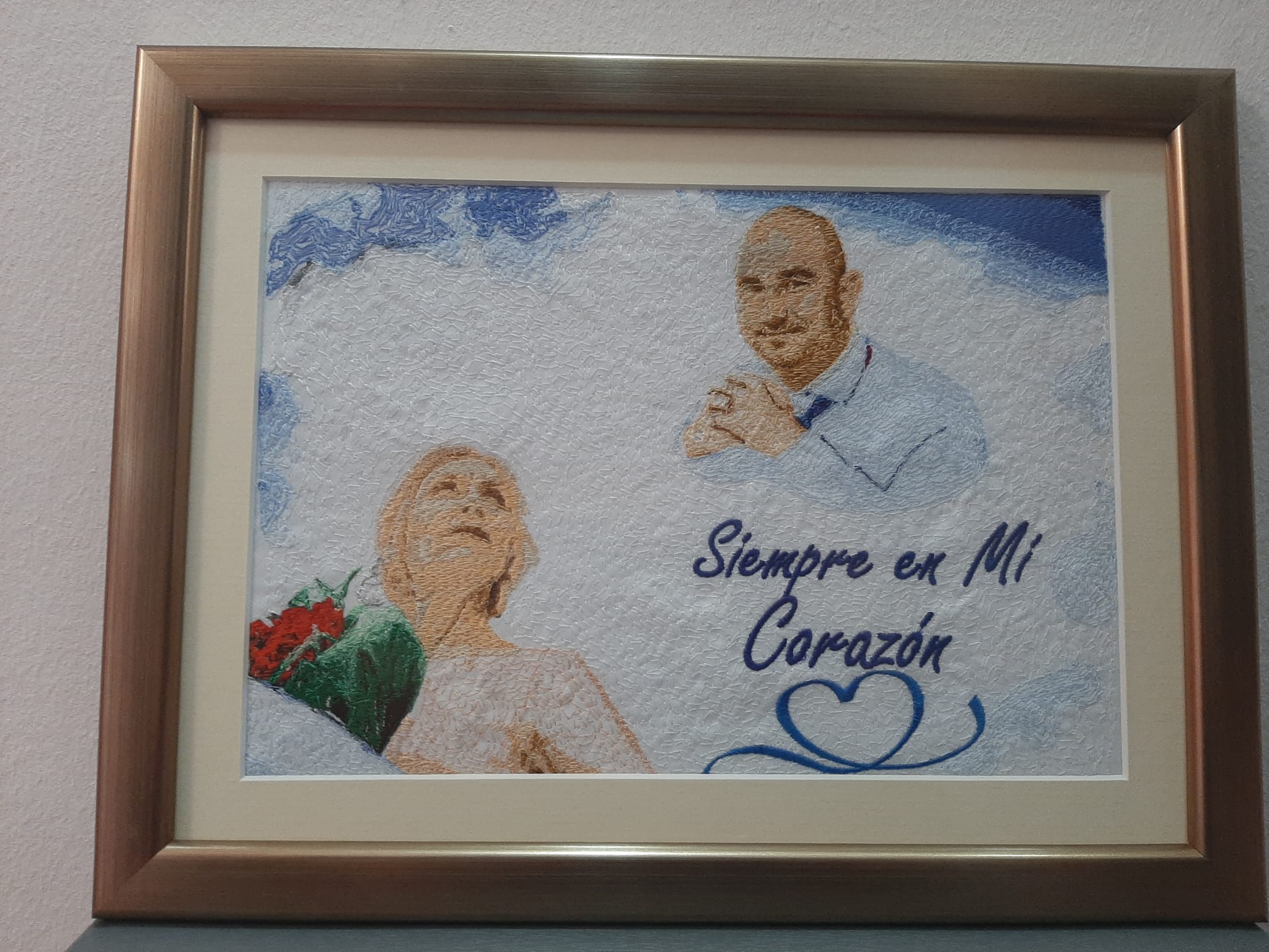 Foto bordada sobre tela con marco, un recuerdo artesanal que transforma tus momentos en arte.