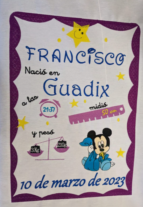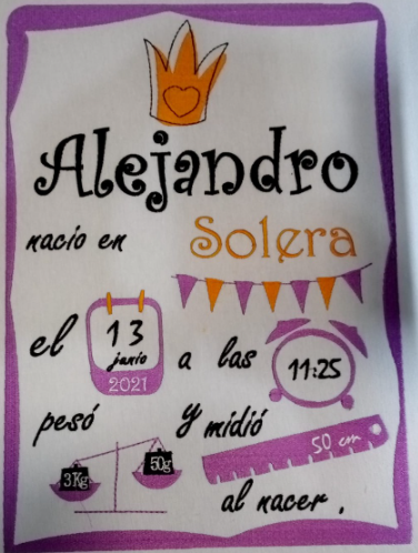 Personalizado con nombre, fecha, hora, peso y medida del bebé.