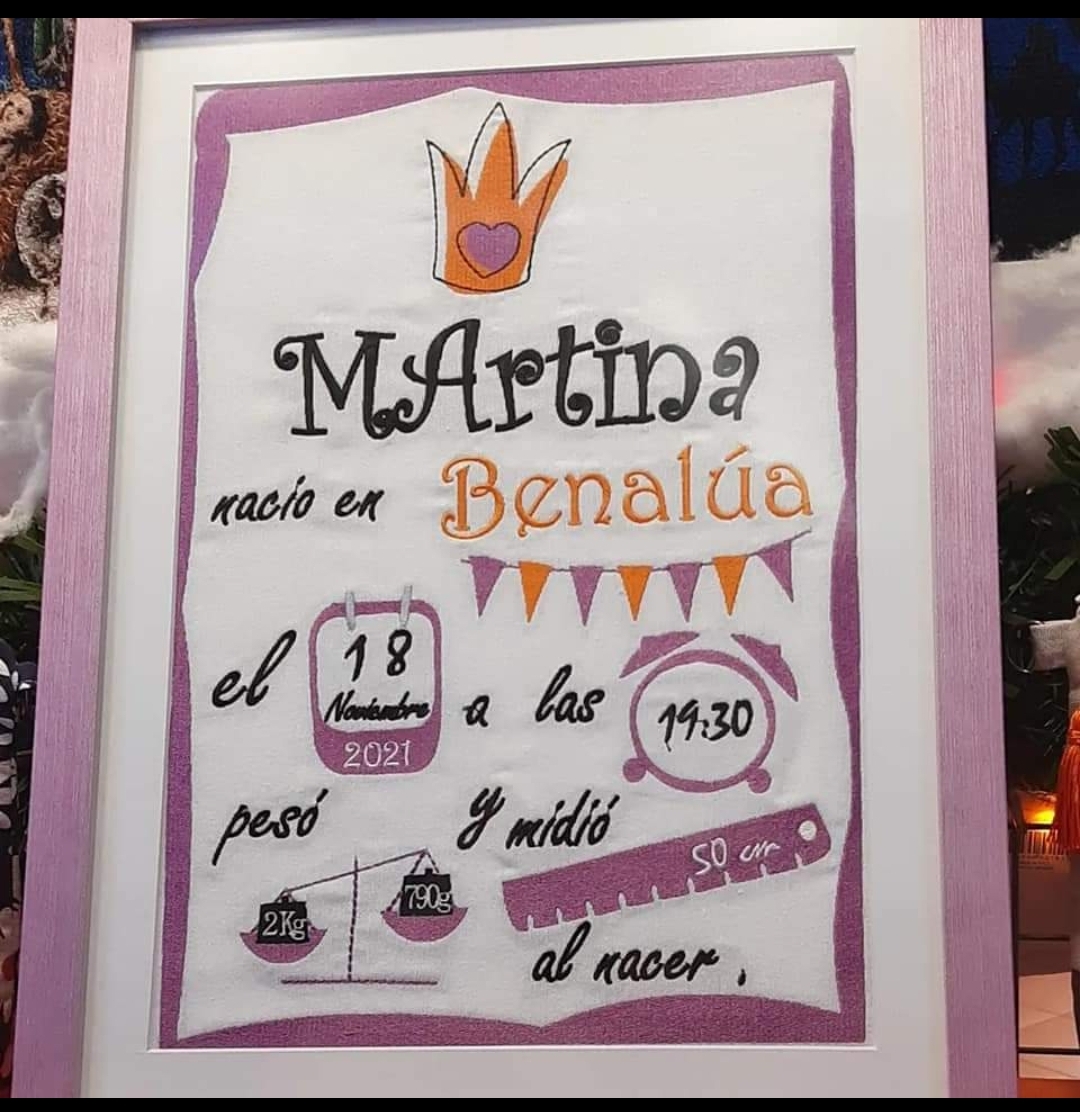 Celebra la llegada de tu bebé con un cuadro natalicio bordado, personalizado con su nombre, fecha y hora de nacimiento, peso y medida. Cada pieza se confecciona con mimo y se presenta en un elegante marco de madera, listo para decorar la habitación del recién nacido o regalar a los nuevos papás.